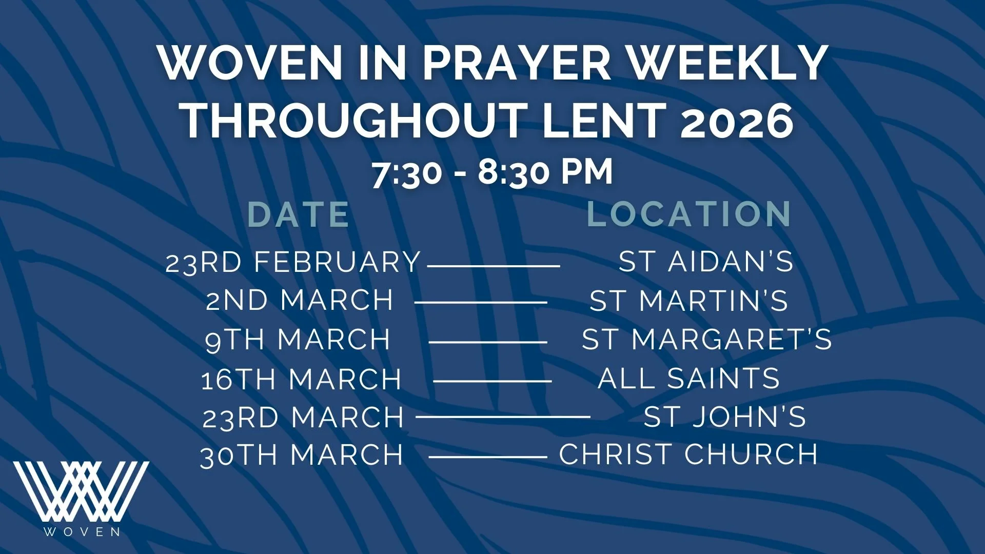 WOVEN IN PRAYER 2026Join us every month as we visit each Woven church to pray with them, in their context. We meet in person from 7:30pm - 8:30pm on the dates and places belowSee you there!
